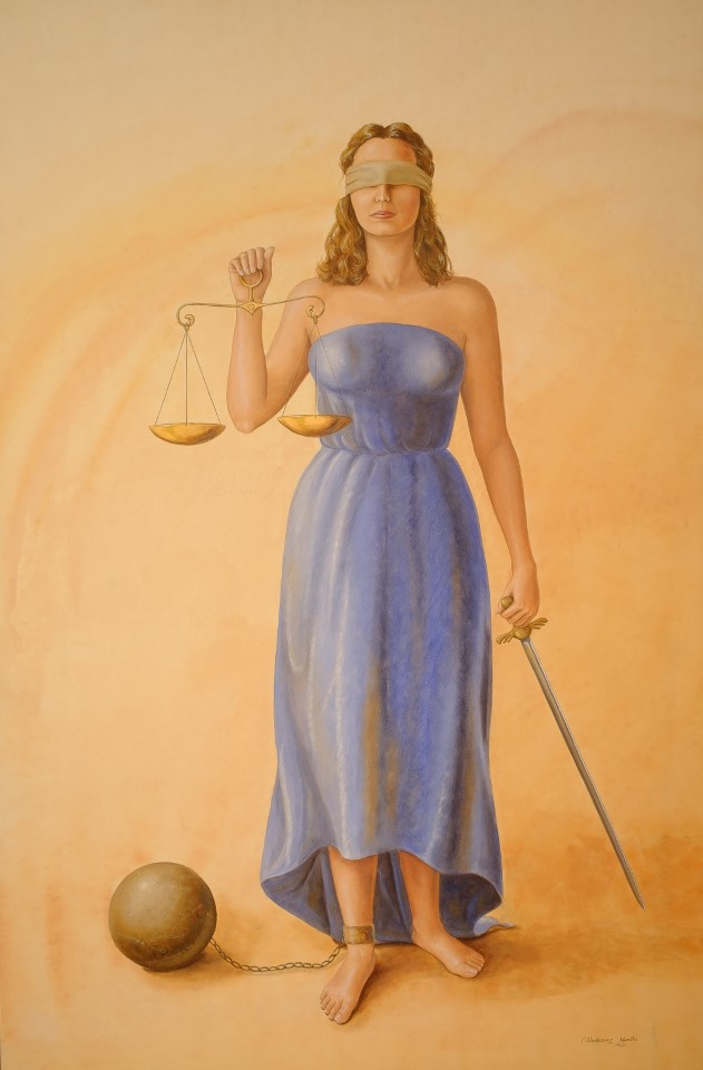 «En esta obra, la diosa Justicia aparece sumida en una lucha constante. Atada a una bola de hierro que representa los obstáculos que impiden el ejercicio pleno de la justicia, lucha por liberarse de sus cadenas. Los escritos en la bola, que aluden a la burocracia, las amenazas y los secretos de Estado, simbolizan las fuerzas que buscan silenciar su voz. Sin embargo, la fragilidad de las cadenas sugiere que la justicia, a pesar de las adversidades, puede prevalecer. Esta obra es un llamado a la reflexión sobre la importancia de la justicia y la necesidad de luchar por un mundo más justo y equitativo.